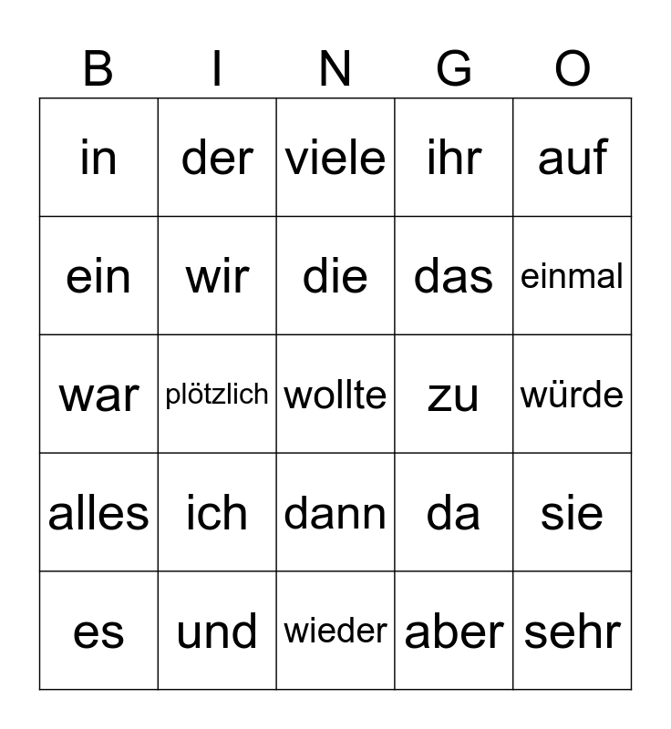 This bingo card has a free space and 24 words: ich, und, die, es, auf, in, ein, der, zu, dann, das, war, da, sie, wir, aber, würde, viele, einmal, plötzlich, sehr, alles, ihr and wieder.