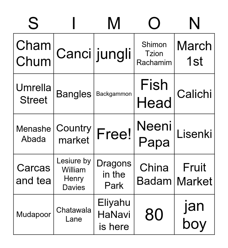 This bingo card has a free space and 45 words: awafi, jan boy, bachara, Mudapoor, samoosas, 80, jungli, Antibes, March 1st, Chatawala Lane, Shimon Tzion Rachamim, Neeni Papa, Dragons in the Park, Lesiure by William Henry Davies, Run ahead and tell mum, Eliyahu HaNavi is here, Peace and quiet, Menashe Abada, Catcati, Calichi, Canci, St Josephs, Kir Kadam, Cham Chum, Lisina, Lisenki, Hodford Road, St Georges Road, China Badam, Carcas and tea, Ala Makala, Fruit Market, Halek, Wah Amartem Zevach, Ohel David, Country market, 54 Windermemere, sephardi, Monopoly, Backgammon, Umrella Street, Fish Head, Curry, Bangles and Bhaji.