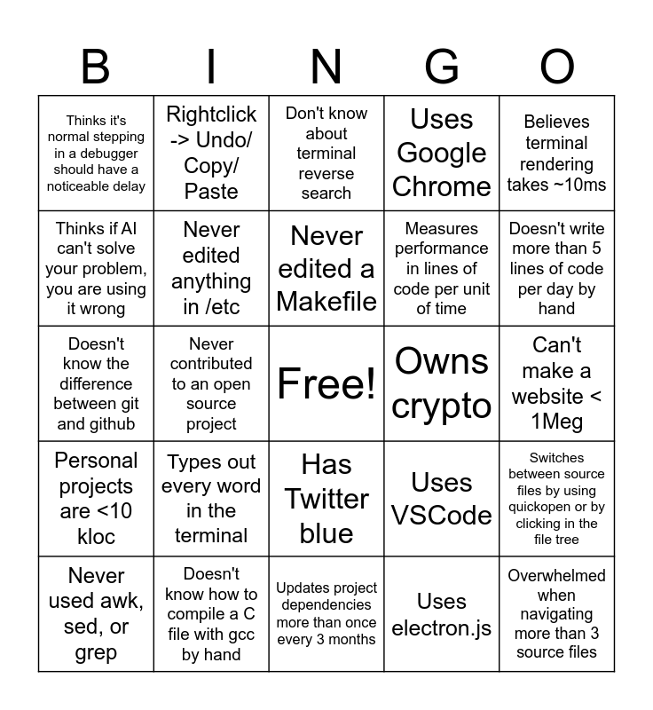 This bingo card has a free space and 24 words: Types out every word in the terminal, Doesn't know how to compile a C file with gcc by hand, Never edited a Makefile, Never used awk, sed, or grep, Believes terminal rendering takes ~10ms, Thinks it's normal stepping in a debugger should have a noticeable delay, Thinks if AI can't solve your problem, you are using it wrong, Rightclick -> Undo/ Copy/ Paste, Owns crypto, Has Twitter blue, Measures performance in lines of code per unit of time, Doesn't know the difference between git and github, Uses VSCode, Switches between source files by using quickopen or by clicking in the file tree, Never edited anything in /etc, Uses electron.js, Can't make a website < 1Meg, Don't know about terminal reverse search, Doesn't write more than 5 lines of code per day by hand, Never contributed to an open source project, Overwhelmed when navigating more than 3 source files, Personal projects are <10 kloc, Uses Google Chrome and Updates project dependencies more than once every 3 months.