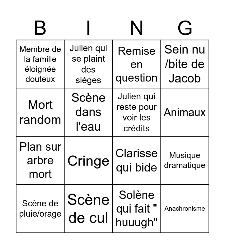 This bingo card has 16 words: Scène de cul, Musique dramatique, Remise en question, Membre de la famille éloignée douteux, Plan sur arbre mort, Julien qui se plaint des sièges, Clarisse qui bide, Solène qui fait " huuugh", Mort random, Scène dans l'eau, Scène de pluie/orage, Sein nu /bite de Jacob, Cringe, Animaux, Julien qui reste pour voir les crédits and Anachronisme.