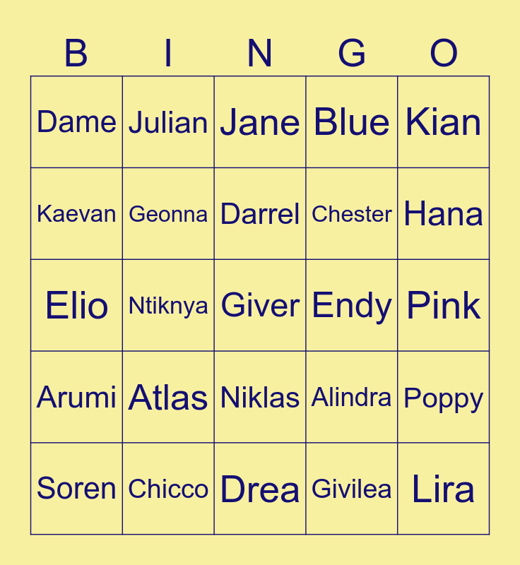 This bingo card has a free space and 24 words: Atlas, Chicco, Darrel, Soren, Kian, Dame, Kaevan, Julian, Endy, Niklas, Chester, Elio, Alindra, Poppy, Geonna, Givilea, Pink, Jane, Hana, Ntiknya, Lira, Arumi, Blue and Drea.