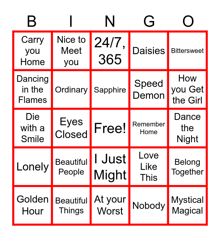 This bingo card has a free space and 40 words: APT, Die with a Smile, Birds of a Feather, Ordinary, Beautiful Things, I Just Might, Sapphire, So Easy, Bittersweet, Lonely, Eyes Closed, Daisies, Mystical Magical, Dance the Night, Remember Home, Beautiful People, Azizam, Carry you Home, Nice to Each Other, 24/7, 365, Belong Together, Nobody, Speed Demon, Dancing in the Flames, Priceless, Stupid in Love, Camera, Do it Again, That Part, Love Again, All my Love, Golden Hour, Last Man Standing, Love Like This, How you Get the Girl, At your Worst, Live More and Love More, Gimme Love, Nice to Meet you and My Home.