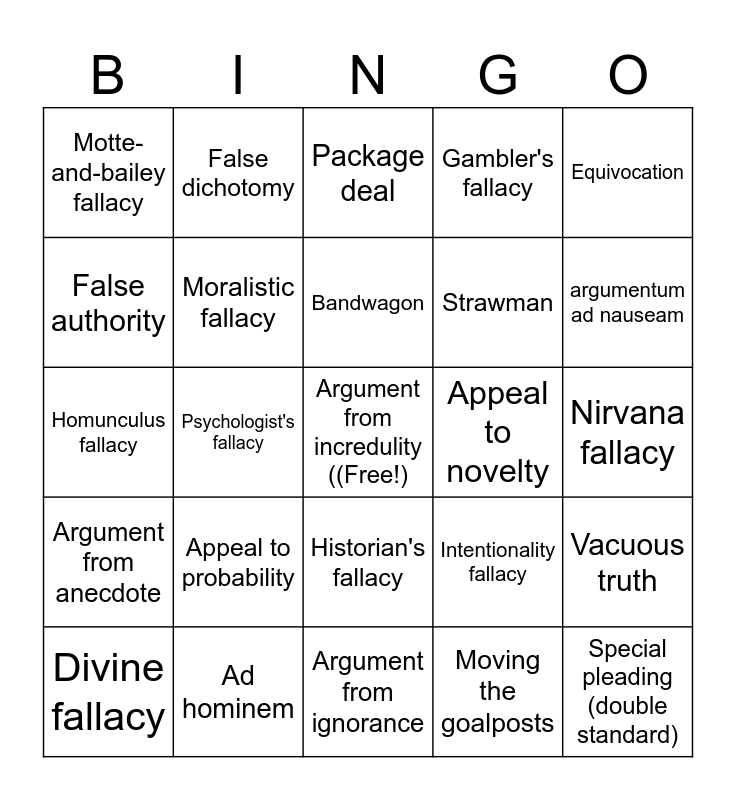 This bingo card has a free space and 24 words: Appeal to probability, Ad hominem, Bandwagon, Divine fallacy, Equivocation, Motte-and-bailey fallacy, False authority, False dichotomy, Appeal to novelty, Historian's fallacy, Strawman, Homunculus fallacy, Intentionality fallacy, Vacuous truth, Moralistic fallacy, Moving the goalposts, Nirvana fallacy, Package deal, argumentum ad nauseam, Psychologist's fallacy, Special pleading (double standard), Argument from anecdote, Gambler's fallacy and Argument from ignorance.