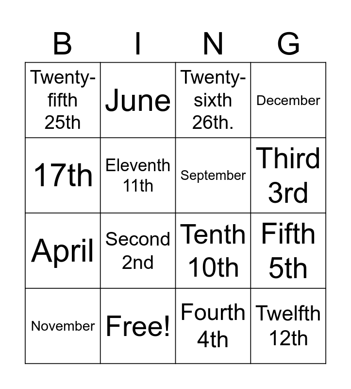 This bingo card has 28 words: January, February, April, Twenty-first 21st, Eleventh 11th, Twenty-sixth 26th., June, Twelfth 12th, Free!, May, Tenth 10th, December, March, First 1st, Second 2nd, Nineth 9th, October, September, Third 3rd, July, Twenty-fifth 25th, August, November, Fifth 5th, Fourth 4th, 16th, 17th and Fourteenth 14th.