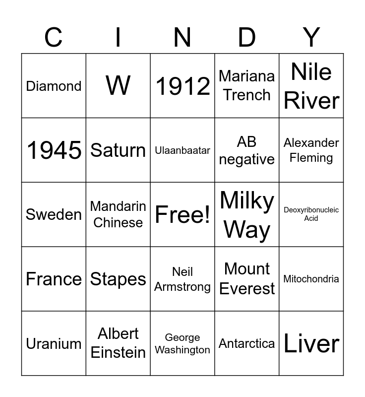 This bingo card has a free space and 24 words: Stapes, Albert Einstein, Ulaanbaatar, Uranium, Nile River, Diamond, 1945, W, Milky Way, Neil Armstrong, AB negative, Sweden, Mount Everest, Mitochondria, Saturn, Antarctica, Deoxyribonucleic Acid, 1912, Alexander Fleming, Mandarin Chinese, Liver, France, Mariana Trench and George Washington.
