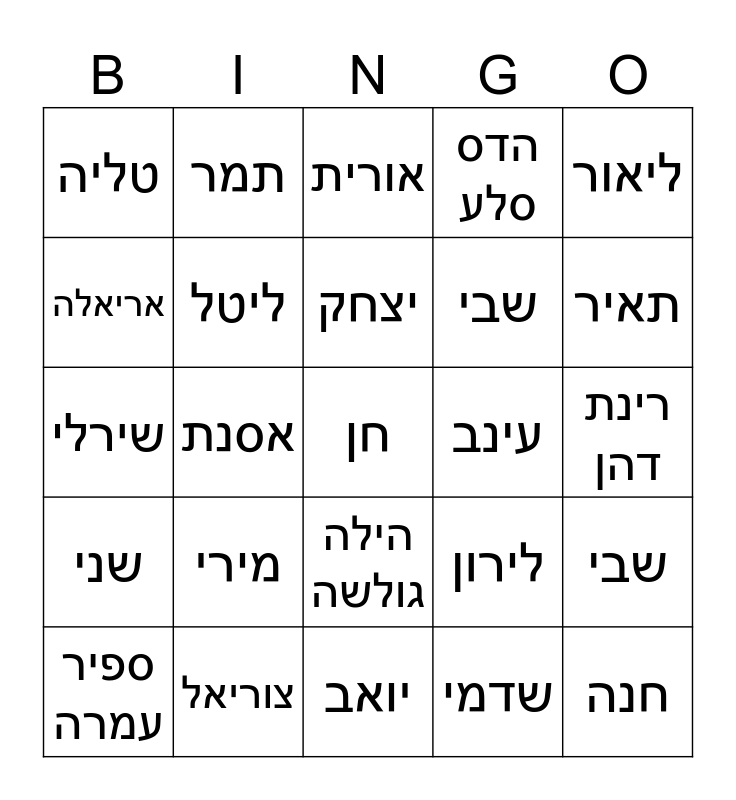This bingo card has 35 words: ניר, אודליה, הילה קשי, ליטל, הילה גולשה, הדס סלע, אריאלה, טלי, יצחק, אליהו, שירלי, ליאור, שירה מרצבך, חפצי, טליה, עינב, שדמי, אסנת, שני, חן, לירון, ספיר עמרה, שבי, צוריאל, אורית, תאיר, חנה, לטי, שבי, רינת דהן, ברכה, יואב, מירי, תמר and יוסי.