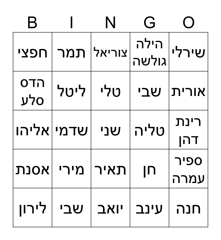 This bingo card has 35 words: ניר, אודליה, הילה קשי, ליטל, תאיר, הילה גולשה, הדס סלע, אריאלה, טלי, יצחק, אליהו, שירלי, ליאור, שירה מרצבך, חפצי, טליה, עינב, שדמי, אסנת, שני, חן, לירון, ספיר עמרה, שבי, צוריאל, אורית, חנה, לטי, שבי, רינת דהן, ברכה, יואב, מירי, תמר and יוסי.
