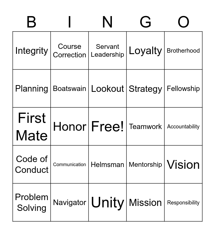 This bingo card has a free space and 40 words: Captain, First Mate, Quartermaster, Boatswain, Navigator, Helmsman, Lookout, Crew, Brotherhood, Code of Conduct, Honor, Loyalty, Responsibility, Accountability, Teamwork, Communication, Courage, Integrity, Respect, Servant Leadership, Vision, Mission, Strategy, Planning, Preparedness, Discipline, Trust, Commitment, Resilience, Adaptability, Initiative, Problem Solving, Decision Making, Mentorship, Fellowship, Unity, Legacy, Growth, Course Correction and Lead the Ship.