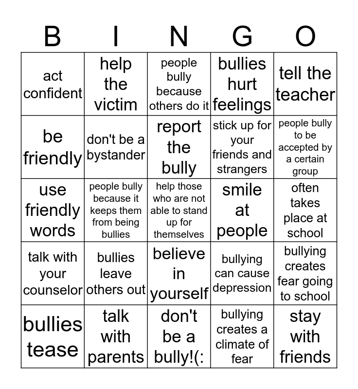 This bingo card has a free space and 24 words: bullies leave others out, talk with parents, report the bully, bullies tease, tell the teacher, act confident, be friendly, help the victim, smile at people, believe in yourself, stick up for your friends and strangers, use friendly words, bullying can cause depression, bullying creates fear going to school, don't be a bystander, bullying creates a climate of fear, often takes place at school, people bully because others do it, people bully to be accepted by a certain group, people bully because it keeps them from being bullies, stay with friends, talk with your counselor, bullies hurt feelings and don't be a bully!(:.