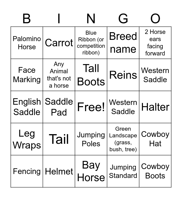 This bingo card has a free space and 32 words: Jumping Standard, Hoof, Saddle Pad, Show Coat, Leg Wraps, Any Animal that's not a horse, 2 Horse ears facing forward, Cowboy Hat, Carrot, Leg Marking, Tall Boots, Blue Ribbon (or competition ribbon), Horse Boots (any purpose), Hock, Western Saddle, Throatlatch, Fencing, English Saddle, Jumping Poles, Tail, Green Landscape (grass, bush, tree), Forelock, Halter, Helmet, Cowboy Boots, Breed name, Reins, Face Marking, Palomino Horse, Bay Horse, Stirrup and Western Saddle.