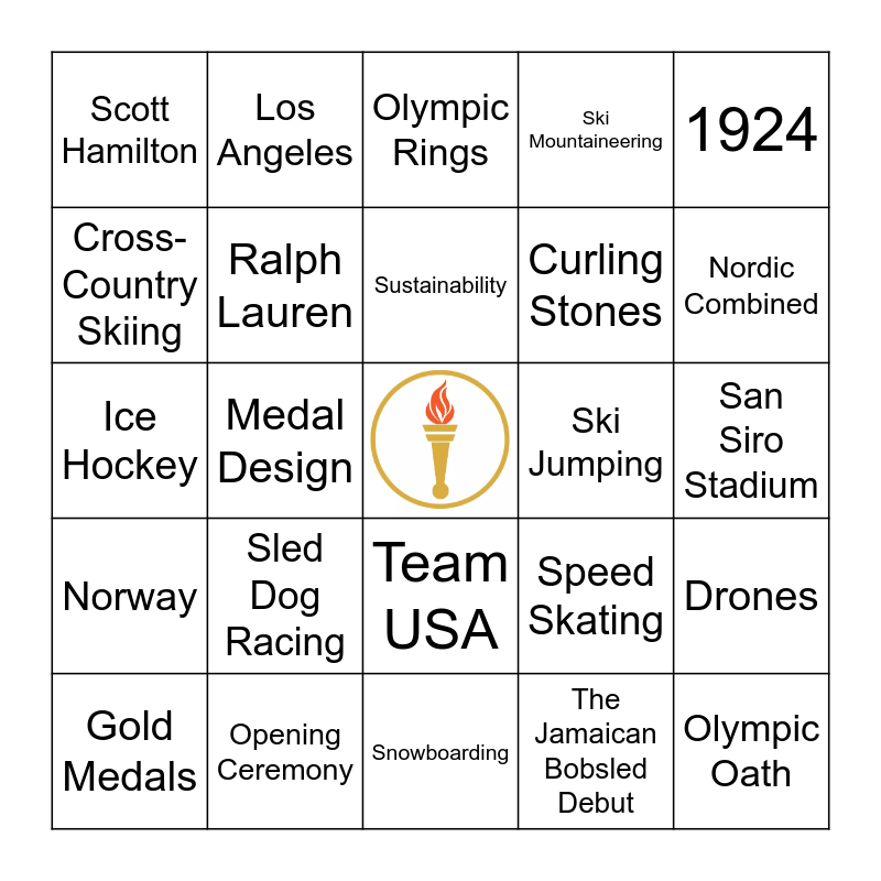 This bingo card has a free space and 50 words: Olympic Torch, Olympic Oath, Luge, Snowboarding, Sled Dog Racing, Short Track Speed Skating, Los Angeles, The Miracle on Ice, Cross-Country Skiing, Bobsled Breakout, Ralph Lauren, Ski Mountaineering, Drones, Speed Skating, Eddie Eagan, The "Kiss and Cry" Area, Sustainability, Ski Jumping, NHL Return, 1924, Medal Design, The Jamaican Bobsled Debut, Scott Hamilton, Curling Stones, Paralympics, Bobsleigh, Nordic Combined, Cortina, Olympic Rings, Team USA, Figure Skating, Milan, Frozen Pucks, Altitude Training, Opening Ceremony, Sled Speeds, Alpine Skiing, Closing Ceremony, Tina and Milo, San Siro Stadium, Biathlon, Curling, Olympic Village, Fake Snow, Gold Medals, Ice Hockey, First Gold Medal, Skeleton, Norway and Freestyle Skiing.
