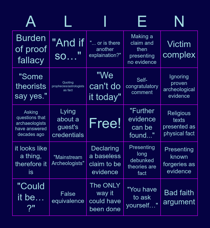 This bingo card has a free space and 24 words: "Mainstream Archeologists", False equivalence, "We can't do it today", "Could it be… ?", Victim complex, Burden of proof fallacy, "Some theorists say yes.", "And if so…", "Further evidence can be found...", Declaring a baseless claim to be evidence, Self-congratulatory comment, Asking questions that archaeologists have answered decades ago, Presenting long debunked theories are fact, Presenting known forgeries as evidence, Quoting prophecies/astrologists as fact, "You have to ask yourself…", Religious texts presented as physical fact, "... or is there another explaination?", Ignoring proven archeological evidence, Lying about a guest's credentials, Bad faith argument, it looks like a thing, therefore it is, Making a claim and then presenting no evidence and The ONLY way it could have been done.