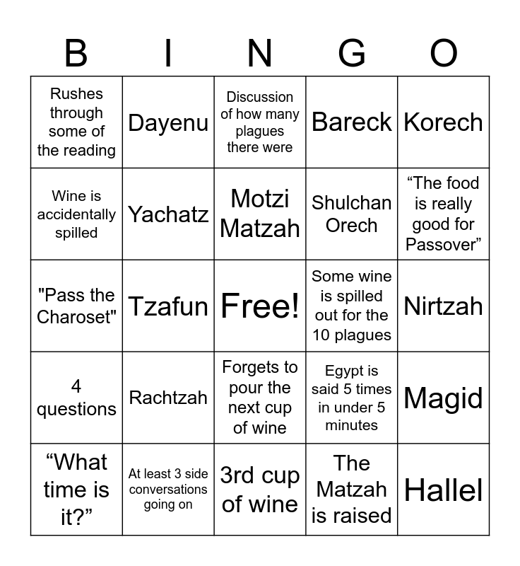 This bingo card has a free space and 38 words: Kadesh, Urchatz, Karpas, Yachatz, Magid, Rachtzah, Motzi Matzah, Marror, Korech, Shulchan Orech, Tzafun, Bareck, Hallel, Nirtzah, Wine is accidentally spilled, 4 questions, The simple son, Discussion of how many plagues there were, Rabbi Elazar ben Azaryah, Some wine is spilled out for the 10 plagues, Rushes through some of the reading, At least 3 side conversations going on, “The food is really good for Passover”, “What time is it?”, Toy jumping frogs make their debut, 3rd cup of wine, The Afikomen is found, Someone complements the Matzah, Someone falls asleep, Eggs are eaten, Someone's Haggadah has a really weird translation, Forgets to pour the next cup of wine, The Matzah is raised, Dayenu, Everyone points to the Maror, Egypt is said 5 times in under 5 minutes, "Pass the Charoset" and "And with an outstretched arm" is read.