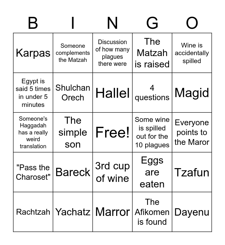 This bingo card has a free space and 38 words: Kadesh, Urchatz, Korech, Shulchan Orech, Tzafun, Bareck, Hallel, Nirtzah, Wine is accidentally spilled, 4 questions, The simple son, The Matzah is raised, Dayenu, Everyone points to the Maror, Egypt is said 5 times in under 5 minutes, "Pass the Charoset", "And with an outstretched arm" is read, Discussion of how many plagues there were, Rabbi Elazar ben Azaryah, Some wine is spilled out for the 10 plagues, Karpas, Yachatz, Magid, Rachtzah, Motzi Matzah, Marror, Rushes through some of the reading, At least 3 side conversations going on, “The food is really good for Passover”, “What time is it?”, Toy jumping frogs make their debut, 3rd cup of wine, The Afikomen is found, Someone complements the Matzah, Someone falls asleep, Eggs are eaten, Someone's Haggadah has a really weird translation and Forgets to pour the next cup of wine.