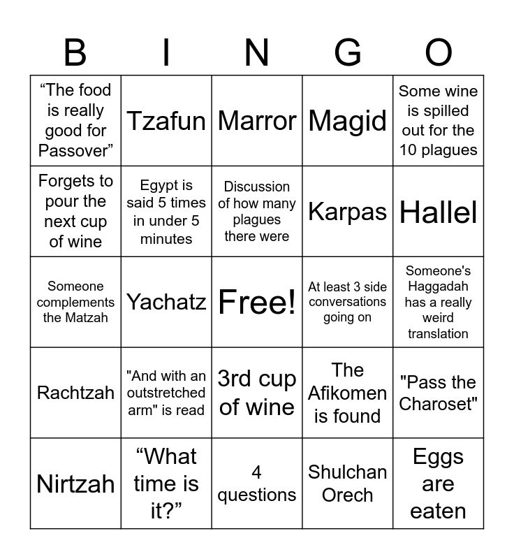 This bingo card has a free space and 38 words: Kadesh, Urchatz, Korech, Egypt is said 5 times in under 5 minutes, "Pass the Charoset", "And with an outstretched arm" is read, Discussion of how many plagues there were, Rabbi Elazar ben Azaryah, Some wine is spilled out for the 10 plagues, Karpas, Yachatz, Magid, Eggs are eaten, Someone's Haggadah has a really weird translation, Forgets to pour the next cup of wine, Rachtzah, Motzi Matzah, Marror, Rushes through some of the reading, At least 3 side conversations going on, “The food is really good for Passover”, “What time is it?”, Hallel, Nirtzah, Wine is accidentally spilled, 4 questions, The simple son, The Matzah is raised, Dayenu, Everyone points to the Maror, Toy jumping frogs make their debut, 3rd cup of wine, Shulchan Orech, Tzafun, Bareck, The Afikomen is found, Someone complements the Matzah and Someone falls asleep.
