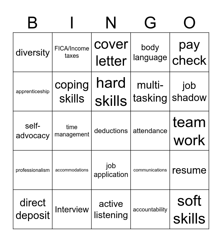 This bingo card has a free space and 24 words: accommodations, Interview, hard skills, direct deposit, pay check, diversity, apprenticeship, FICA/Income taxes, attendance, job application, multi-tasking, self-advocacy, communications, resume, coping skills, accountability, team work, cover letter, job shadow, time management, soft skills, professionalism, body language and active listening.