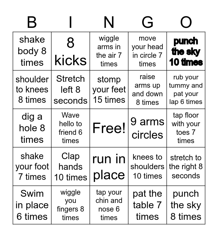 This bingo card has a free space and 24 words: Clap hands 10 times, wiggle you fingers 8 times, stomp your feet 15 times, Swim in place 6 times, punch the sky 10 times, shake body 8 times, shoulder to knees 8 times, 8 kicks, 9 arms circles, run in place, raise arms up and down 8 times, dig a hole 8 times, knees to shoulders 10 times, stretch to the right 8 seconds, Stretch left 8 seconds, pat the table 7 times, tap floor with your toes 7 times, wiggle arms in the air 7 times, rub your tummy and pat your lap 6 times, Wave hello to friend 6 times, punch the sky 8 times, shake your foot 7 times, move your head in circle 7 times and tap your chin and nose 6 times.