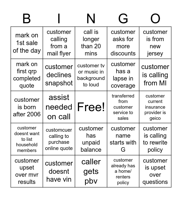 This bingo card has a free space and 24 words: customcuer calling to purchase online quote, customer doesnt have vin, customer tv or music in background to loud, customer upset over mvr results, customer is from new jersey, mark on 1st sale of the day, mark on first qrp completed quote, customer calling from a mail flyer, transferred from customer service to sales, customer has unpaid balance, customer has a lapse in coverage, customer is born after 2006, customer name starts with G, customer is calling to rewrite policy, customer declines snapshot, customer already has a home/ renters policy, customer current insurance provider is geico, call is longer than 20 mins, customer is calling from MI, assist needed on call, customer is upset over questions, customer doesnt want to list household members, customer asks for more discounts and caller gets pbv.