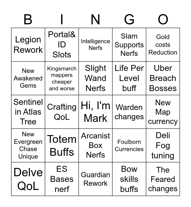 This bingo card has a free space and 24 words: Totem Buffs, ES Bases nerf, Slight Wand Nerfs, Delve QoL, Gold costs Reduction, Legion Rework, New Awakened Gems, Portal& ID Slots, Warden changes, Arcanist Box Nerfs, Life Per Level buff, Sentinel in Atlas Tree, Foulborn Currencies, Deli Fog tuning, Kingsmarch mappers cheaper and worse, Bow skills buffs, New Map currency, Intelligence Nerfs, Uber Breach Bosses, Crafting QoL, The Feared changes, New Evergreen Chase Unique, Slam Supports Nerfs and Guardian Rework.