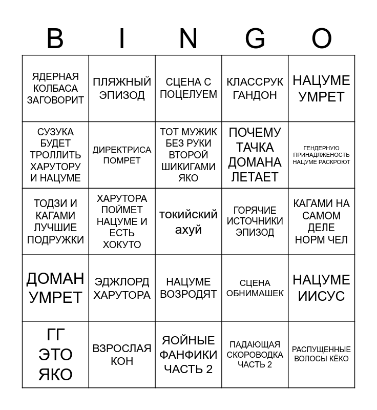 This bingo card has a free space and 24 words: ЭДЖЛОРД ХАРУТОРА, ВЗРОСЛАЯ КОН, ТОТ МУЖИК БЕЗ РУКИ ВТОРОЙ ШИКИГАМИ ЯКО, ГГ ЭТО ЯКО, НАЦУМЕ УМРЕТ, ЯДЕРНАЯ КОЛБАСА ЗАГОВОРИТ, СУЗУКА БУДЕТ ТРОЛЛИТЬ ХАРУТОРУ И НАЦУМЕ, ПЛЯЖНЫЙ ЭПИЗОД, ГОРЯЧИЕ ИСТОЧНИКИ ЭПИЗОД, НАЦУМЕ ВОЗРОДЯТ, ПОЧЕМУ ТАЧКА ДОМАНА ЛЕТАЕТ, ТОДЗИ И КАГАМИ ЛУЧШИЕ ПОДРУЖКИ, СЦЕНА ОБНИМАШЕК, НАЦУМЕ ИИСУС, ДИРЕКТРИСА ПОМРЕТ, ПАДАЮЩАЯ СКОРОВОДКА ЧАСТЬ 2, КАГАМИ НА САМОМ ДЕЛЕ НОРМ ЧЕЛ, СЦЕНА С ПОЦЕЛУЕМ, ГЕНДЕРНУЮ ПРИНАДЛЖЕНОСТЬ НАЦУМЕ РАСКРОЮТ, ХАРУТОРА ПОЙМЕТ НАЦУМЕ И ЕСТЬ ХОКУТО, РАСПУЩЕННЫЕ ВОЛОСЫ КЁКО, ДОМАН УМРЕТ, КЛАССРУК ГАНДОН and ЯОЙНЫЕ ФАНФИКИ ЧАСТЬ 2.