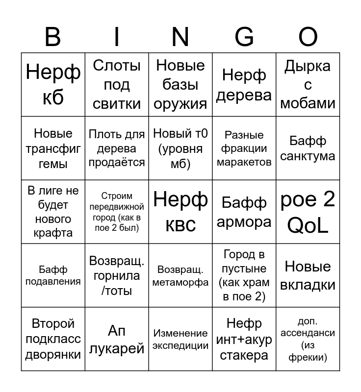 This bingo card has a free space and 24 words: Возвращ. горнила /тоты, Ап лукарей, Новый т0 (уровня мб), Второй подкласс дворянки, Дырка с мобами, Нерф кб, Новые трансфиг гемы, Слоты под свитки, Бафф армора, Возвращ. метаморфа, Разные фракции маракетов, В лиге не будет нового крафта, Город в пустыне (как храм в пое 2), Новые вкладки, Плоть для дерева продаётся, Нефр инт+акур стакера, poe 2 QoL, Новые базы оружия, Бафф санктума, Строим передвижной город (как в пое 2 был), доп. ассенданси (из фрекии), Бафф подавления, Нерф дерева and Изменение экспедиции.