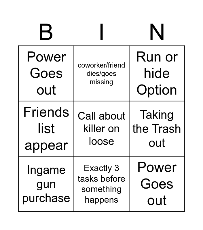 This bingo card has 10 words: Exactly 3 tasks before something happens, Run or hide Option, Power Goes out, Call about killer on loose, Friends list appear, Ingame gun purchase, coworker/friend dies/goes missing, Shitty in game purchases everywhere, Taking the Trash out and Power Goes out.