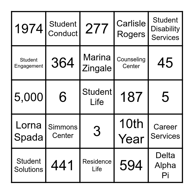 This bingo card has a free space and 24 words: Simmons Center, 441, Marina Zingale, Student Solutions, Student Disability Services, 1974, Student Engagement, Student Conduct, 187, 3, Counseling Center, 5,000, 10th Year, Career Services, 364, 594, 5, 277, 45, 6, Delta Alpha Pi, Lorna Spada, Carlisle Rogers and Residence Life.