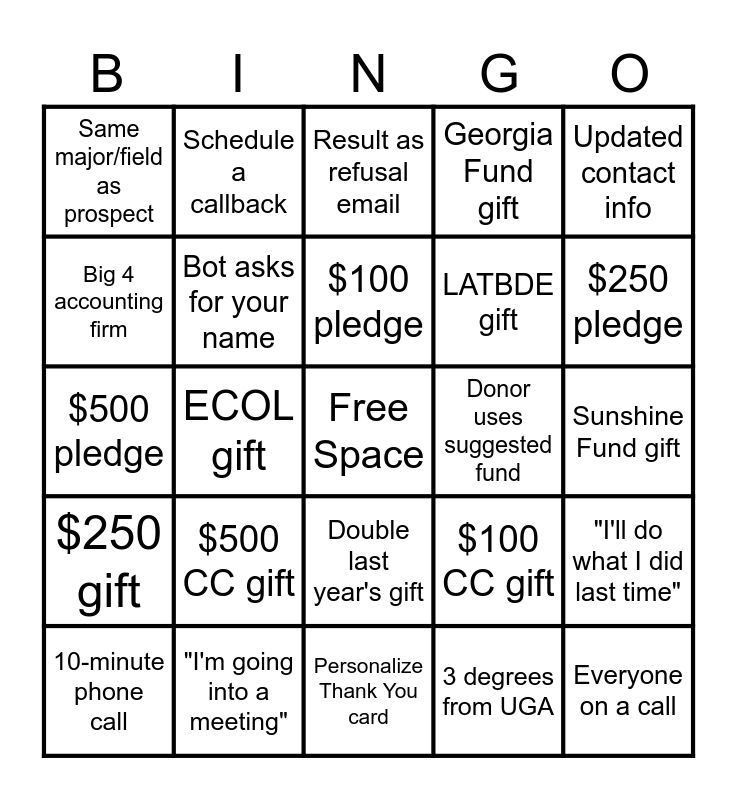 This bingo card has a free space and 24 words: $500 CC gift, "I'm going into a meeting", $100 pledge, 10-minute phone call, Updated contact info, Same major/field as prospect, Big 4 accounting firm, Schedule a callback, Donor uses suggested fund, Double last year's gift, LATBDE gift, $500 pledge, $100 CC gift, "I'll do what I did last time", Bot asks for your name, 3 degrees from UGA, Sunshine Fund gift, Result as refusal email, $250 pledge, ECOL gift, Everyone on a call, $250 gift, Georgia Fund gift and Personalize Thank You card.