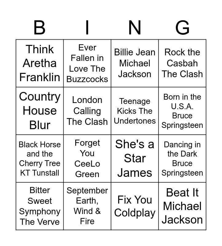 This bingo card has 76 words: Free!, Don't Stop Me Now Queen, Billie Jean Michael Jackson, Summer Nights John Travolta & Olivia Newton-John, Tiny Dancer Elton John, Karma Chameleon Culture Club, Uptown Girl Billy Joel, The Final Countdown Europe, Jolene Dolly Parton, My Girl The Temptations, I Will Survive Gloria Gaynor, American Pie Don McLean, Born in the U.S.A. Bruce Springsteen, London Calling The Clash, In the Navy Village People, Dancing in the Dark Bruce Springsteen, Losing My Religion R.E.M., Bitter Sweet Symphony The Verve, Disco 2000 Pulp, Country House Blur, Champagne Supernova Oasis, She's a Star James, Teenage Kicks The Undertones, Ever Fallen in Love The Buzzcocks, Rock the Casbah The Clash, Uptown Funk Mark Ronson ft. Bruno Mars, Shape of You Ed Sheeran, Blinding Lights The Weeknd, As It Was Harry Styles, Can't Stop the Feeling! Justin Timberlake, Happy Pharrell Williams, Rolling in the Deep Adele, You Know I'm No Good Amy Winehouse, Mercy Duffy, Forget You CeeLo Green, Black Horse and the Cherry Tree KT Tunstall, Use Somebody Kings of Leon, Chasing Cars Snow Patrol, Fix You Coldplay, One Way or Another Blondie, Brass in Pocket The Pretenders, Edge of Seventeen Stevie Nicks, Dreams Fleetwood Mac, Let's Dance David Bowie, Purple Rain Prince, Don't Go Breaking My Heart Elton John & Kiki Dee, I Got You (I Feel Good) James Brown, Think Aretha Franklin, Son of a Preacher Man Dusty Springfield, You're So Vain Carly Simon, Islands in the Stream Dolly Parton & Kenny Rogers, Always on My Mind Pet Shop Boys, Blue Monday New Order, Love Will Tear Us Apart Joy Division, Just Can't Get Enough Depeche Mode, Rio Duran Duran, Video Killed the Radio Star The Buggles, Cars Gary Numan, Sir Duke Stevie Wonder, Here Comes the Rain Again Eurythmics, Like a Prayer Madonna, Physical Olivia Newton-John, Walk of Life Dire Straits, Rasputin Boney M., Signed, Sealed, Delivered Stevie Wonder, ABC Jackson 5, September Earth, Wind & Fire, We Are Family Sister Sledge, Young Hearts Run Free Candi Staton, Dancing on the Ceiling Lionel Richie, All Night Long Lionel Richie, Beat It Michael Jackson, Thriller Michael Jackson, Man in the Mirror Michael Jackson, Take a Chance on Me ABBA and Knowing Me Knowing You ABBA.