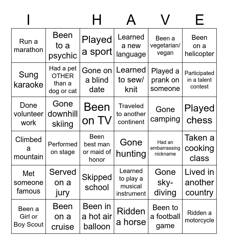 This bingo card has 36 words: Learned to play a musical instrument, Skipped school, Ridden a horse, Sung karaoke, Climbed a mountain, Traveled to another continent, Had a pet OTHER than a dog or cat, Been in a hot air balloon, Been a vegetarian/ vegan, Gone sky-diving, Participated in a talent contest, Learned a new language, Lived in another country, Gone downhill skiing, Learned to sew/ knit, Run a marathon, Met someone famous, Gone camping, Done volunteer work, Played a sport, Been on TV, Performed on stage, Gone hunting, Been best man or maid of honor, Had an embarrassing nickname, Been to a psychic, Played a prank on someone, Been on a cruise, Gone on a blind date, Been on a helicopter, Ridden a motorcycle, Been a Girl or Boy Scout, Taken a cooking class, Played chess, Served on a jury and Been to a football game.