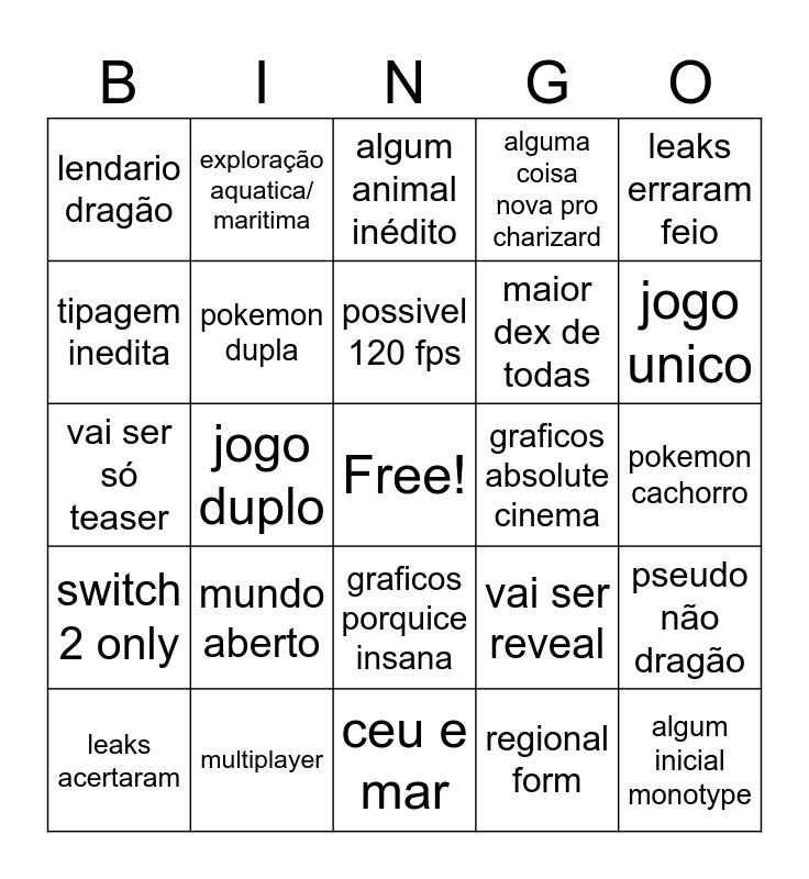 This bingo card has a free space and 24 words: mundo aberto, multiplayer, possivel 120 fps, leaks acertaram, leaks erraram feio, lendario dragão, tipagem inedita, exploração aquatica/ maritima, graficos absolute cinema, graficos porquice insana, maior dex de todas, vai ser só teaser, vai ser reveal, pseudo não dragão, pokemon dupla, regional form, pokemon cachorro, algum animal inédito, jogo unico, jogo duplo, algum inicial monotype, switch 2 only, alguma coisa nova pro charizard and ceu e mar.
