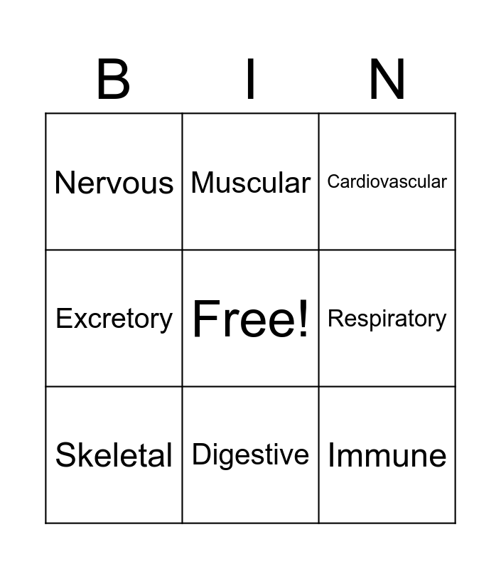 This bingo card has a free space and 8 words: Respiratory, Cardiovascular, Muscular, Skeletal, Nervous, Immune, Excretory and Digestive.