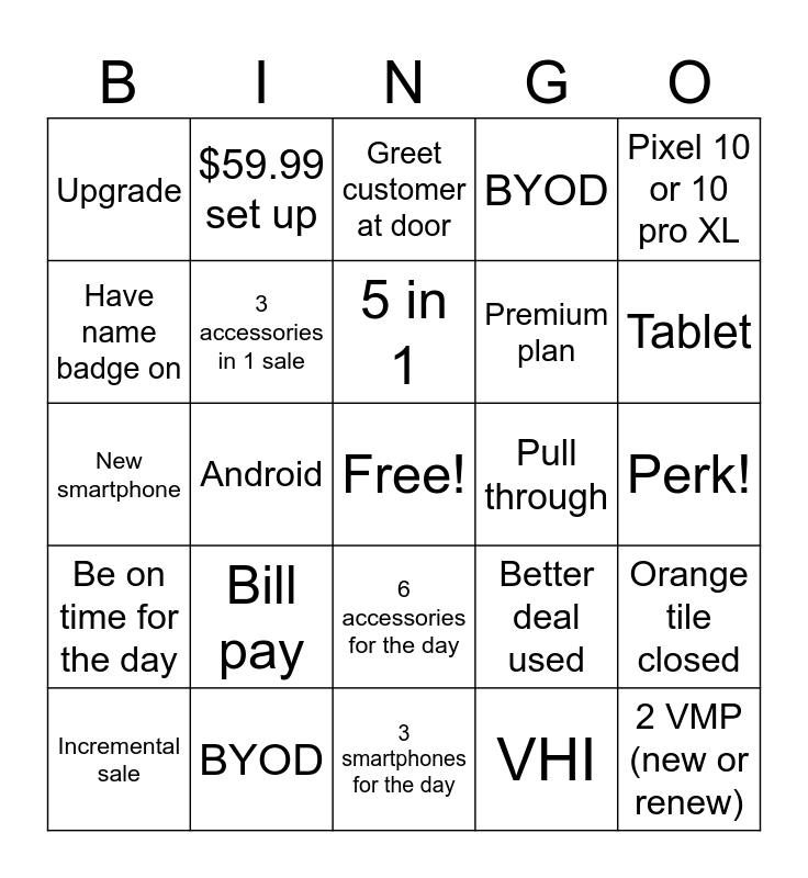 This bingo card has a free space and 24 words: Bill pay, BYOD, 5 in 1, Incremental sale, Pixel 10 or 10 pro XL, Upgrade, Have name badge on, $59.99 set up, Pull through, 6 accessories for the day, Premium plan, New smartphone, Better deal used, Orange tile closed, 3 accessories in 1 sale, VHI, Perk!, Greet customer at door, Tablet, Android, 2 VMP (new or renew), Be on time for the day, BYOD and 3 smartphones for the day.