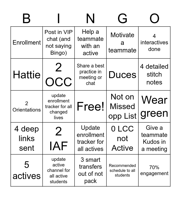 This bingo card has a free space and 29 words: 5 actives, 4 actives, update enrollment tracker for all changed lives, OCC, Enrollment, Help a teammate with an active, 2 OCC, 2 IAF, Not on Missed opp List, update active channel for all active students, Wear green, 70% engagement, 3 smart transfers out of not pack, Recommended schedule to all students, 4 detailed stitch notes, 3 ME1000 sessions, Update enrollment tracker for all actives, 4 deep links sent, 4 interactives done, 2 Orientations, 0 LCC not Active, 3 Roll Call completed, Duces, Hattie, Motivate a teammate, Post in VIP chat (and not saying Bingo), Give a teammate Kudos in a meeting, Share a best practice in meeting or chat and Call all students on your books before lunch.