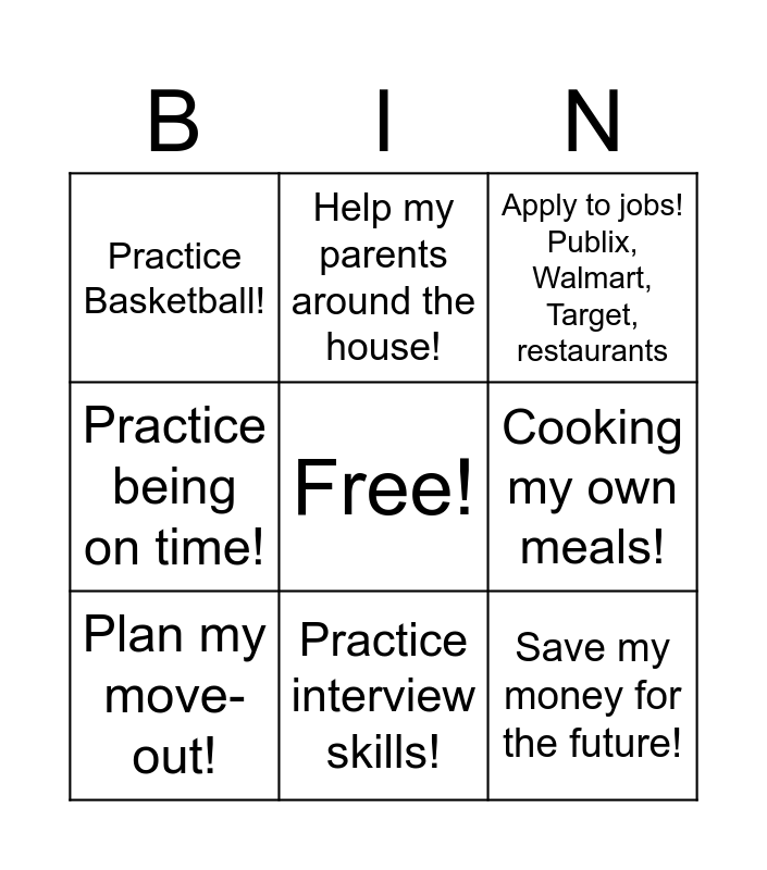 This bingo card has a free space and 8 words: Cooking my own meals!, Apply to jobs! Publix, Walmart, Target, restaurants, Help my parents around the house!, Plan my move-out!, Practice Basketball!, Save my money for the future!, Practice being on time! and Practice interview skills!.