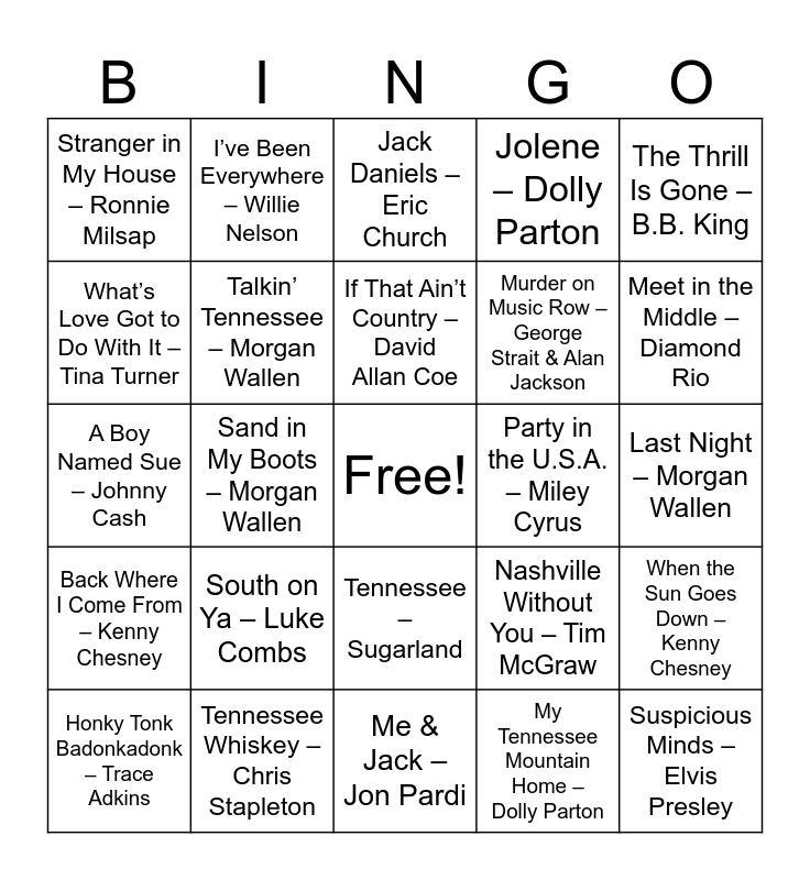 This bingo card has a free space and 61 words: Walking in Memphis – Marc Cohn, Tennessee Whiskey – Chris Stapleton, Rocky Top – Osborne Brothers, Back Where I Come From – Kenny Chesney, My Tennessee Mountain Home – Dolly Parton, Dixieland Delight – Alabama, Talkin’ Tennessee – Morgan Wallen, Smoky Mountain Rain – Ronnie Milsap, Murder on Music Row – George Strait & Alan Jackson, Tennessee Mountain Top – Kid Rock, Jolene – Dolly Parton, TN – Morgan Wallen, What’s Love Got to Do With It – Tina Turner, Tennessee Orange – Megan Moroney, Midnight Train to Memphis – Chris Stapleton, Stranger in My House – Ronnie Milsap, Suspicious Minds – Elvis Presley, The Thrill Is Gone – B.B. King, Drink You Away – Justin Timberlake, If That Ain’t Country – David Allan Coe, Party in the U.S.A. – Miley Cyrus, Jack Daniels – Eric Church, Honky Tonk Badonkadonk – Trace Adkins, When the Sun Goes Down – Kenny Chesney, Ramblin’ Man – The Allman Brothers Band, Half of My Hometown – Kelsea Ballerini, Memphis, Tennessee – Chuck Berry, Tennessee Line – Daughtry, Meet in the Middle – Diamond Rio, Wrong Side of Memphis – Trisha Yearwood, Me & Tennessee – Tim McGraw, Texas to Tennessee – Clay Walker, She Thinks My Tractor’s Sexy – Kenny Chesney, Back to Tennessee – Billy Ray Cyrus, I’ve Been Everywhere – Willie Nelson, We Can’t Stop – Miley Cyrus, Whiskey Glasses – Morgan Wallen, Sand in My Boots – Morgan Wallen, Young – Kenny Chesney, A Boy Named Sue – Johnny Cash, Graceland – Paul Simon, South on Ya – Luke Combs, Last Night – Morgan Wallen, Thinkin’ ’Bout You – Dustin Lynch, Nashville Without You – Tim McGraw, Copperhead Road – Steve Earle, I Go Back – Kenny Chesney, Proud Mary – Tina Turner, I’m the Problem – Morgan Wallen, Tennessee – Sugarland, Me & Jack – Jon Pardi, SexyBack – Justin Timberlake, Use Somebody – Kings of Leon, Beautiful Mess – Diamond Rio, Slicin’ Sand – Elvis Presley, Southern Land – Upchurch, Still Into You – Paramore, All My Ex’s Live in Texas – George Strait, Music City Queen – Miranda Lambert, Folsom Prison Blues – Johnny Cash and Jack Daniel’s, If You Please — David Allan Coe.