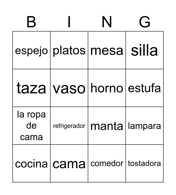 This bingo card has 16 words: cama, lampara, mesa, espejo, la ropa de cama, platos, manta, comedor, taza, vaso, cocina, silla, refrigerador, estufa, horno and tostadora.