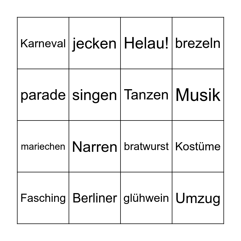 This bingo card has 16 words: Berliner, Kostüme, Helau!, Karneval, mariechen, jecken, bratwurst, glühwein, parade, singen, Fasching, brezeln, Narren, Musik, Tanzen and Umzug.