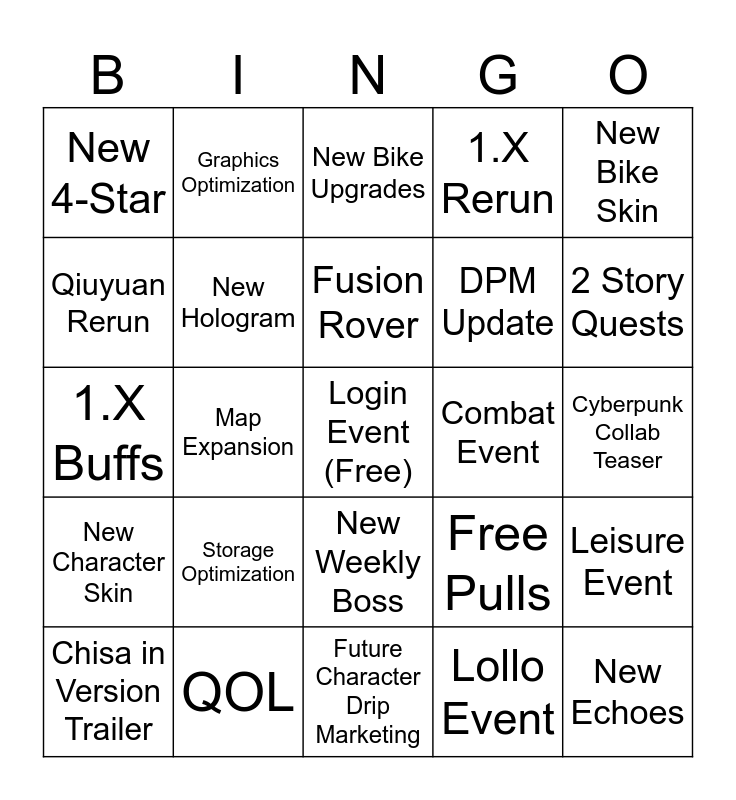 This bingo card has a free space and 24 words: Storage Optimization, QOL, Fusion Rover, Chisa in Version Trailer, New Bike Skin, New 4-Star, Qiuyuan Rerun, Graphics Optimization, Combat Event, New Weekly Boss, DPM Update, 1.X Buffs, Free Pulls, Leisure Event, New Hologram, Lollo Event, Cyberpunk Collab Teaser, New Bike Upgrades, 2 Story Quests, Map Expansion, New Echoes, New Character Skin, 1.X Rerun and Future Character Drip Marketing.