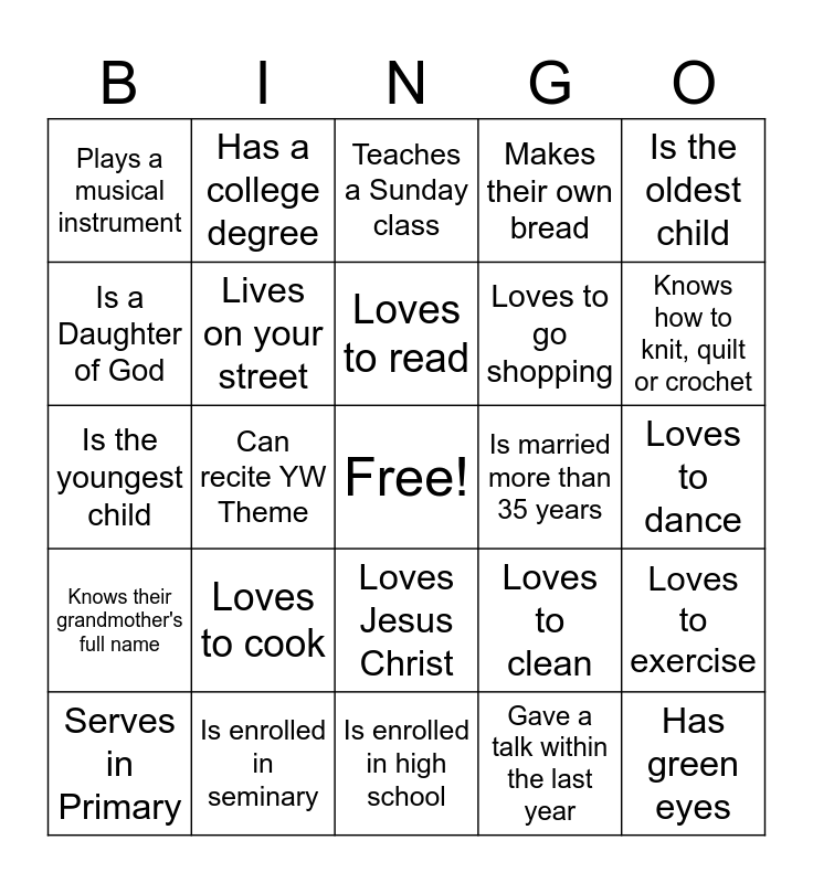 This bingo card has a free space and 29 words: Serves in Primary, Serves in Young Women, Can recite YW Theme, Loves to sing, Plays a musical instrument, Teaches a Sunday class, Lives on your street, Loves to cook, Is married more than 35 years, Is enrolled in seminary, Loves to dance, Has green eyes, Is enrolled in high school, Gave a talk within the last year, Knows how to knit, quilt or crochet, Is taking some kind of extra class, Loves Jesus Christ, Knows their grandmother's full name, Is the oldest child, Is the youngest child, Loves to clean, Leaves the last load in the dryer, Loves to go shopping, Is a Daughter of God, Makes their own bread, Has a college degree, Loves to exercise, Loves to read and Has milked a cow or goat.