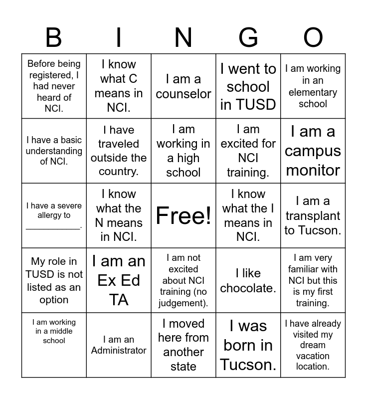 This bingo card has a free space and 24 words: I am an Ex Ed TA, I am an Administrator, I am working in a high school, I am working in a middle school, I am working in an elementary school, Before being registered, I had never heard of NCI., I have a basic understanding of NCI., I know what C means in NCI., I know what the I means in NCI., I am not excited about NCI training (no judgement)., I am excited for NCI training., I have a severe allergy to ____________., I like chocolate., I am very familiar with NCI but this is my first training., I have traveled outside the country., I was born in Tucson., I am a transplant to Tucson., I am a counselor, I am a campus monitor, I know what the N means in NCI., I have already visited my dream vacation location., My role in TUSD is not listed as an option, I went to school in TUSD and I moved here from another state.