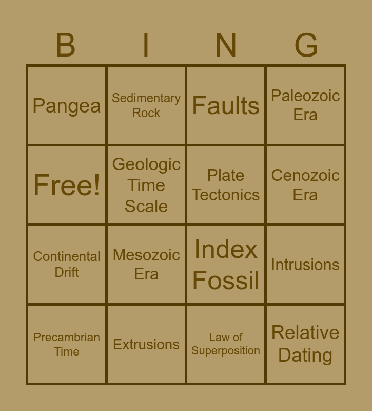 This bingo card has a free space and 24 words: Mold, Cast, Petrified Fossil, Preserved Remains, Carbon Film, Trace Fossil, Index Fossil, Law of Superposition, Geologic Time Scale, Precambrian Time, Paleozoic Era, Mesozoic Era, Cenozoic Era, Extinction, Relative Dating, Pangea, Extrusions, Intrusions, Continental Drift, Sedimentary Rock, Plate Tectonics, Faults, Fossil Record and Eras.
