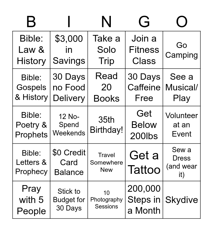 This bingo card has a free space and 24 words: Pray with 5 People, $0 Credit Card Balance, Read 20 Books, 200,000 Steps in a Month, Go Camping, Bible: Law & History, $3,000 in Savings, Take a Solo Trip, Get Below 200lbs, Volunteer at an Event, Bible: Poetry & Prophets, 30 Days no Food Delivery, Get a Tattoo, Sew a Dress (and wear it), Bible: Gospels & History, Stick to Budget for 30 Days, 10 Photography Sessions, Join a Fitness Class, See a Musical/ Play, Bible: Letters & Prophecy, 12 No-Spend Weekends, Travel Somewhere New, 30 Days Caffeine Free and Skydive.