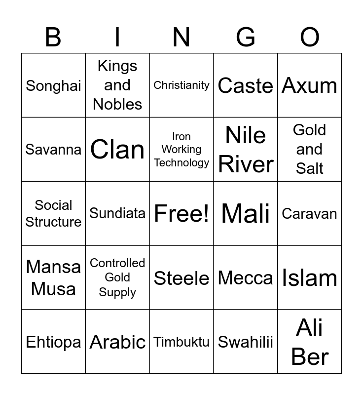 This bingo card has a free space and 35 words: Plateau, Labor Specilization, Hajj, Clan, Steele, Caste, Savanna, Trans-Sahara, Iron Working Technology, Scholarship, Social Structure, Axum, Kush, Ghana, Songhai, Mali, Swahilii, Sundiata, Mansa Musa, Ali Ber, Mecca, Ehtiopa, Islam, Arabic, Christianity, Gold and Salt, Niger River, Senegal River, Nile River, Caravan, Natural Resource, Timbuktu, Controlled Gold Supply, Kings and Nobles and Involved Rituals and Honored Ancestors.
