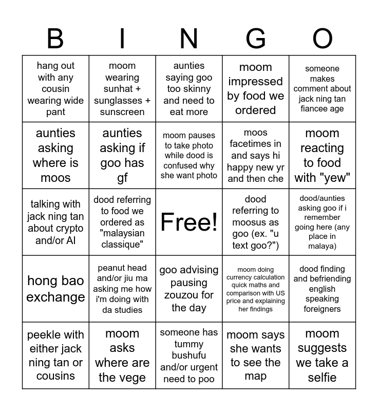 This bingo card has a free space and 24 words: peanut head and/or jiu ma asking me how i'm doing with da studies, moom asks where are the vege, moom pauses to take photo while dood is confused why she want photo, peekle with either jack ning tan or cousins, someone makes comment about jack ning tan fiancee age, hang out with any cousin wearing wide pant, aunties asking where is moos, moom wearing sunhat + sunglasses + sunscreen, dood referring to moosus as goo (ex. "u text goo?"), goo advising pausing zouzou for the day, moos facetimes in and says hi happy new yr and then che, talking with jack ning tan about crypto and/or AI, moom doing currency calculation quick maths and comparison with US price and explaining her findings, dood finding and befriending english speaking foreigners, aunties asking if goo has gf, moom says she wants to see the map, dood/aunties asking goo if i remember going here (any place in malaya), aunties saying goo too skinny and need to eat more, moom reacting to food with "yew", dood referring to food we ordered as "malaysian classique", moom suggests we take a selfie, hong bao exchange, moom impressed by food we ordered and someone has tummy bushufu and/or urgent need to poo.