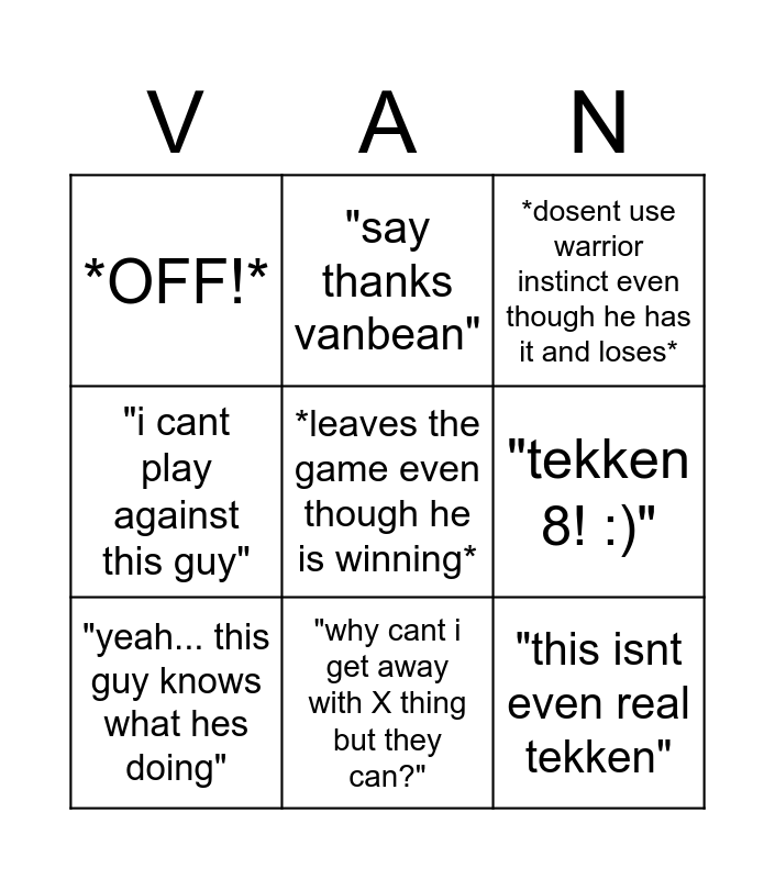 This bingo card has a free space and 11 words: "yeah.. i can't beat people who play like this", "why cant i get away with X thing but they can?", "this isnt even real tekken", "yeah... this guy knows what hes doing", "say thanks vanbean", *dosent use warrior instinct even though he has it and loses*, "tekken 8! :)", "alright dude", "i cant play against this guy", *OFF!* and "I just wanted to play heihachi and i cant".