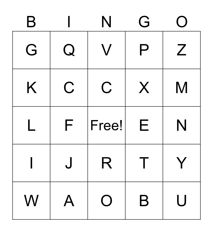 This bingo card has a free space and 24 words: J, A, C, W, Z, G, K, Q, E, R, X, L, T, Y, C, B, N, V, M, F, U, I, P and O.