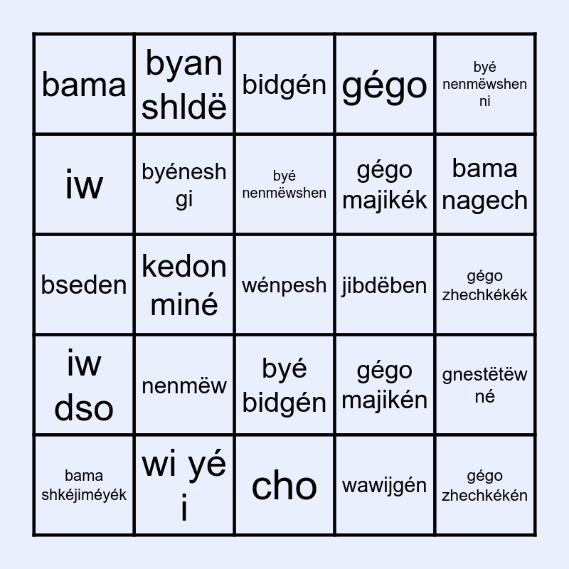 This bingo card has a free space and 37 words: byédon i, byédon ni, byénesh o, byénesh gi, gnestëtëw né, nenmëw, byé nenmëwshen, byé nenmëwshen i, byé nenmëwshen ni, gigdon, kedon miné, gégo, gégo zhechkékén, gégo zhechkékék, iw, iw dso, bonikën, bidgén, byé bidgén, jibdëben, bama, bama nagech, bama shkéjiméyék, cho, cho wi, wawijgén, byan shldë, nëbyégén, migwéch, igwëyen, majin, wi yé i, bseden, bsedëwshen, gégo majikén, gégo majikék and gnestëtan né.