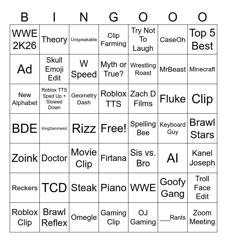 This bingo card has a free space and 48 words: WWE, MrBeast, Gaming Clip, KingSammelot, Geometry Dash, Brawl Stars, Theory, Brawl Reflex, CaseOh, Firtana, Top 5 Best, Clip Farming, Fluke, Zach D Films, Reckers, Keyboard Guy, Ad, Minecraft, Goofy Gang, Try Not To Laugh, Wrestling Roast, Rizz, WWE 2K26, Skull Emoji Edit, Troll Face Edit, W Speed, Clip, Roblox Clip, Roblox TTS, Roblox TTS Sped Up + Slowed Down, ___Rants, Spelling Bee, Kanel Joseph, TCD, BDE, Sis vs. Bro, AI, New Alphabet, Movie Clip, Steak, Zoink, Zoom Meeting, Unspeakable, Omegle, Myth or True?, Piano, Doctor and OJ Gaming.