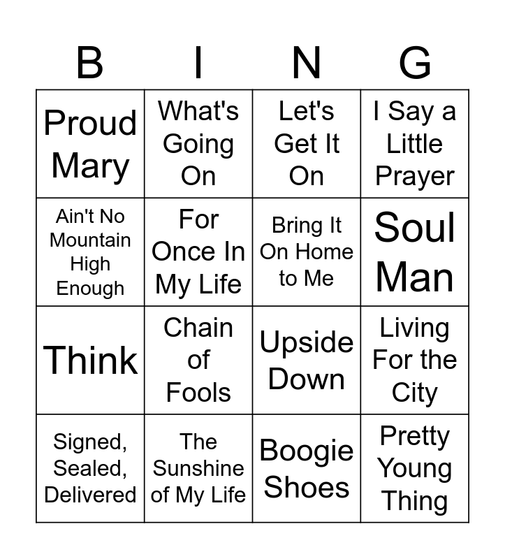 This bingo card has 53 words: Free!, Signed, Sealed, Delivered, Heard Through Grapevine, Higher and Higher, Dock of the Bay, A Natural Woman, What's Going On, Midnight Train to Georgia, For Once In My Life, Lean on Me, Bring It On Home to Me, Higher Ground, I Say a Little Prayer, Superstition, Can't Get Enough of Your Love, Reach Out, I'll Be There, Soul Man, The Sunshine of My Life, Ain't Too Proud to Beg, Ain't No Mountain High Enough, Living For the City, Rescue Me, Think, Proud Mary, Baby, I Love You, Sweet Sweet Baby, It Takes Two, Dance to the Music, A Change is Gonna Come, Chain of Fools, I Can't Help Myself, In the Midnight Hour, Dancing in the Street, Lady Marmalade, Baby Love, My Guy, I Say a Little Prayer, How Sweet It Is, Let's Get It On, Someday We'll Be Together, An Everlasting Love, I'm Coming Out, Boogie Shoes, Get Down Tonight, Build Me Up Buttercup, Right Back Where We Started, Dancing in the Moonlight, Isn't She Lovely, Upside Down, Pretty Young Thing, Get Down On It, L-O-V-E and Let's Groove.